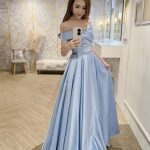 Off shoulder plunged neckline A-line gown with a self waist belt.