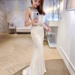 Exquisite beading design covers this entire gown with sheer long sleeve, slim fit, and train in back.