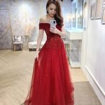 Delicate sequin bodice tulle A-line gown with a off shoulder neckline.